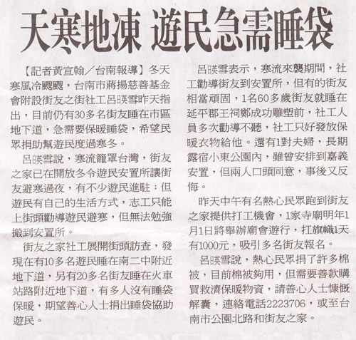 冬天寒風冷颼颼,台南市蔣揚慈善基金會附設街友旅館社工呂暎雪昨天指出,目前仍有30多名街友睡在市區地下道,急需要保暖睡袋,希望民眾捐助幫遊民度過寒冬。 呂暎雪說,寒流籠罩台灣,街友旅館已在開放冬令遊民安置所讓街友避寒過夜,有不少遊民進駐;但遊民有自己的生活方式,志工只能上街頭勸導遊民避寒,但無法勉強搬到安置所。 街友旅館社工展開街頭訪查,發現在有10多名遊民睡在南二中附近地下道,另有20多名街友睡在火車站路附近地下道,有多人沒有睡袋保暖,期望善心人士捐出睡袋協助遊民。 呂暎雪表示,寒流來襲期間,社工勸導街友到安置所,但有的街友相當頑固,1名60多歲街友就睡在延平郡王祠鄭成功雕塑前,社工人員多次勸導不聽,社工只好發放保暖衣物給他。還有1對夫婦,長期露宿小東公園內,雖曾安排到嘉義安置,但兩人口頭同意,事後又反悔。 昨天中午有名熱心民眾跑到街友旅館提供打工機會,1家寺廟明年1月1日將舉辦廟會遊行,扛旗幟1天有1000元,吸引多名街友報名。 呂暎雪說,熱心民眾捐了許多棉被,目前棉被夠用,但需要善款購買救濟保暖物資,請善心人士慷慨解囊,連絡電話2223706,或至台南市公園北路和街友旅館。