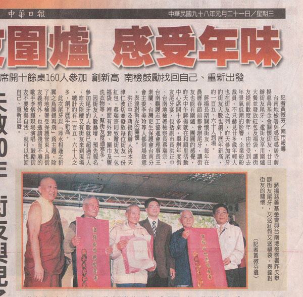 台南地檢署與噶瑪噶居寺蔣揚慈善基金會關懷街友,廿日辦街友尾牙,邀街友享用圍爐大餐並發放紅包及福袋,讓街友提前歡度新年;由於受到去年景氣低潮的影響,企業紛紛裁員,不只赫見廿多歲年輕人也在街友之列,昨天參加尾牙的街友人數也創下歷年新高,約一百五、六十人到場。