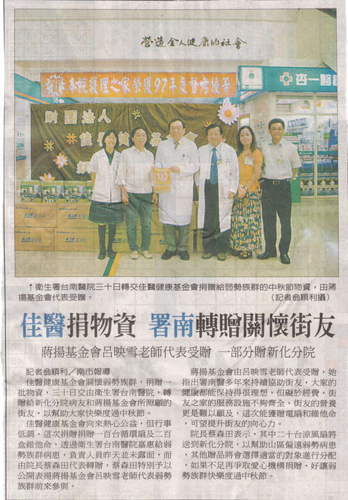 蔣揚基金會呂映雪老師代表受贈一部分贈新化分院 佳醫健康基金會關懷弱勢族群,捐贈一批物資,三十日交由衛生署台南醫院,轉贈給新化分院病友和蔣揚基金會所照顧的街友,以幫助大家快樂度過中秋節。佳醫健康基金會向來熱心公益,但行事低調,這次捐贈捐贈一百台循環扇及二百盒維他命,透過衛生署台南醫院嘉惠給弱勢族群病患,負責人員昨天並未露面,而由院長蔡森田代表轉贈,蔡森田特別予以公開表揚蔣揚基金會呂暎雪老師代表弱勢族群前來參與。蔣揚基金會由呂暎雪老師代表受贈,她指出署南醫多年來持續協助街友,大家的健康都能保持得很理想,但礙於經費,街友旅館的服務設施不夠齊全,街友的營養更是難以顧及,這次能獲贈電扇和維他命,可望提升街友的向心力。院長蔡森田表示,其中二十台涼風扇將送到新化分院,以幫助山區偏遠弱勢病患,其他贈品將會選擇適當的對象進行分配,如果不足再爭取愛心機構捐贈,好讓弱勢族群快樂度過中秋節。 |