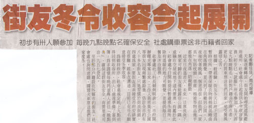 近來日夜溫差大。未來一旦寒流南下,無家可歸的街友僅能露宿公園一隅,或躲在空屋或地下道內禦寒。有鑑於此,社會處今日開始提供暫避寒冬場所,除有溫暖的地方可睡覺。並提供每日三餐及沐浴服務,社會處社工科長賴炯明表示,市府開辦曙光專案以來,工作人員密集至公園等街友出現頻繁處勘查,估計全市約有八十多名街友。只是習慣於街浪街頭,四處為家,要街友乖乖接受市府安排實在很難,經多次溝通,目前已有卅名願意接受冬季收容。