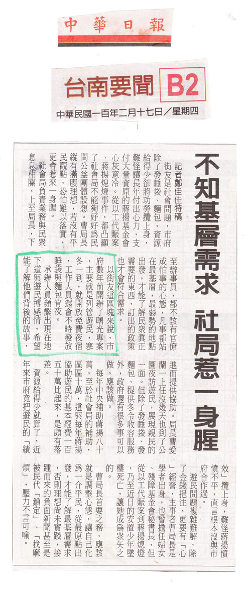 街友是社會問題,市府除了發睡袋、麵包,資源給得少卻將功勞攬上身,難怪讓長年付出心力,支付大量資原的蔣揚基金會心灰意冷。從以工代賑案、蔣揚熄燈事件,都凸顯了社會局不能夠好好為民間號公益團體設想。曹局長縱有滿腹理想,若沒有平民觀點,恐怕難以落實,更會惹來一身腥。